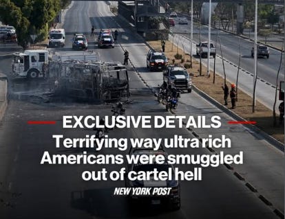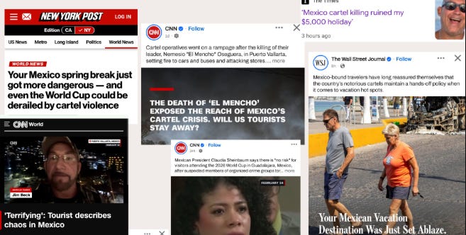 US mainstream media makes Mexico’s suffering about US tourists - After the US has driven the so-called War on Drugs in Mexico for the past 20 decades, leading to hundreds of thousands of deaths and forced disappearances, then largely forced the Mexican government to capture the head of the organised crime corporation, the CJNG, the US media then made the ensuing violence about US tourists. Many states shut down schools and universities after the CJNG responded to the death of the cartel leader, El Mencho, with hundreds of roadblocks, burning public buses and public banks (not typically used by tourists, but which locals depend on). Some 60 security forces and organised criminals were killed in confrontations. -AP, AP